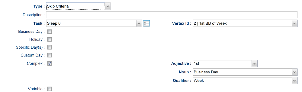 B-03218 | Run Criteria expanded to include "Week" as a Complex Qualifier | For Example "Skip on 1st Business Day of Week".