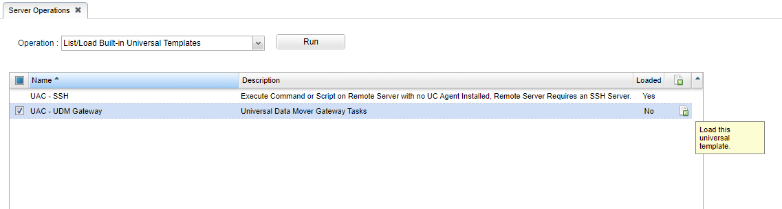 B-10773 | Built-in Universal Templates | Certain Universal Templates created and maintained by Stonebranch are now available directly within the Universal Controller product package. A new Administration, Server Operation called List/Load Built-in Universal Templates has been added to allow customer to activate these Universal templates. Listing and Loading the Built-in Universal Templates will require the ops_admin role or the ops_server_operation_admin role.