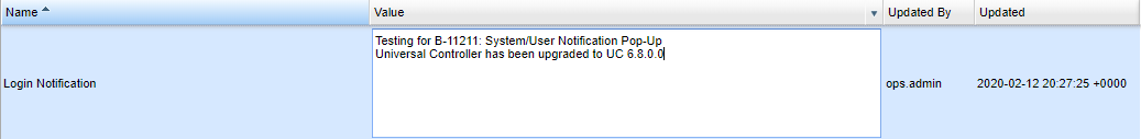 B-11211 | System wide user notifications | System Administrators now have the ability to send system wide notifications to users when they login. A new System Property "Login Notification" has been added to allow the system admins to define a message that will be displayed when a users completes a successful login to the Universal Controller.