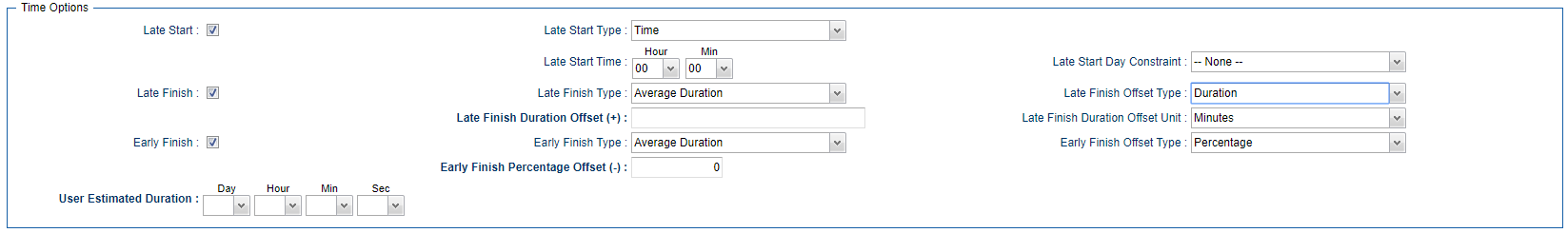 When selecting the Average Duration, you have the option to use the Average Duration as is or specify a duration or percentage offset, for example Late Finish based on average Duration plus 1 minute, or Late finish based on average Duration plus 20%. |