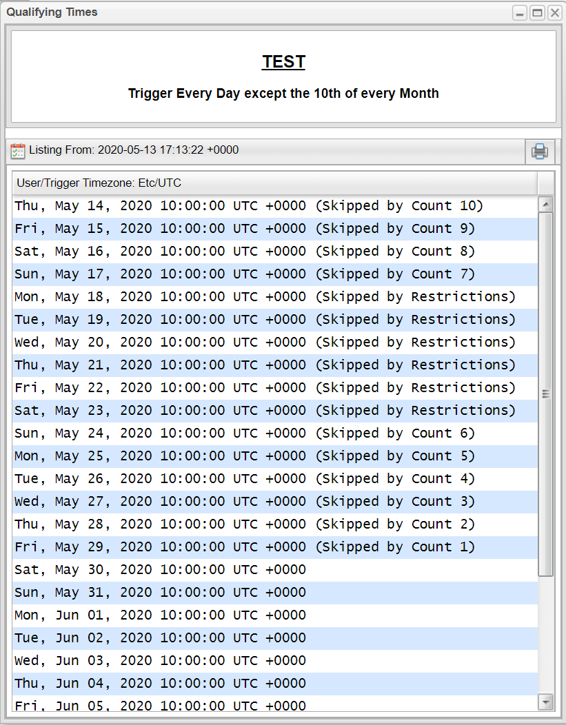 When listing qualifying times in this case you will clearly see when and why the trigger is skipped.