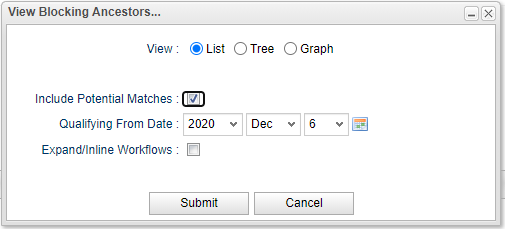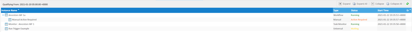 E-01495 | View Blocking Ancestors (i.e Blocking Jobs) | To assist in analysis of why a task is waiting the Activity, Task Instances, and Workflow Monitor displays provide a new right click option to View Blocking Ancestors for task instances that are in a workflow and have not started (i.e. Defined, Waiting or Held status). Previously, when viewing dependencies for a task instance using View Predecessors/Successors, only direct predecessors within the same workflow are listed. View Blocking Ancestors traverses the workflow hierarchy to list all the blocking ancestors of the task instance. Once selected the following dialog will be displayed: