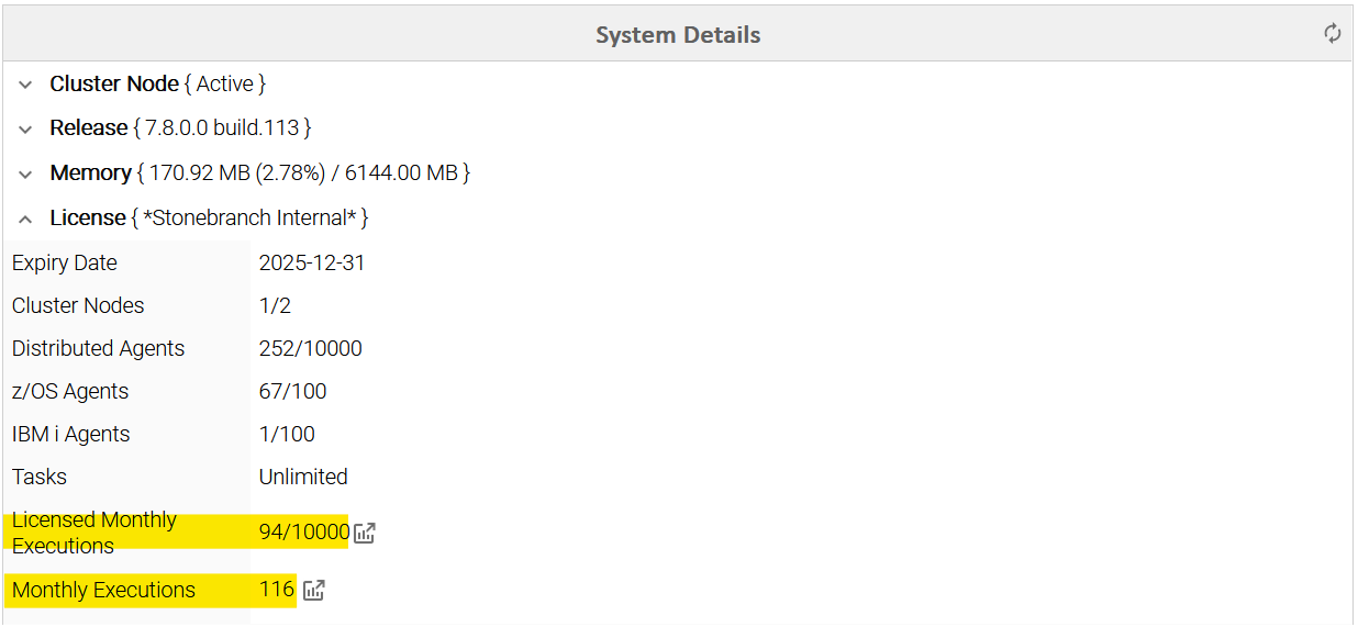 B-20714 B-20715 | Monitoring for both licensed monthly executions and total monthly executions. | You can now view statistics for both licensed monthly executions and total monthly executions. Previously, you could only view licensed monthly executions. From the System Details widget and metrics, you can now see: