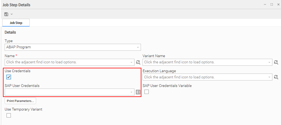 B-20727* | SAP User Name Restrictions for SAP Enhanced View. | A new Credential type, SAP Credentials, has been introduced. An SAP type Credential can be specified as the task-level SAP Credentials for an SAP Task. You can also use an SAP type Credential when adding a Job Step. A new field, Use Credentials, has been added to the Job Step Details form. This checkbox toggles between using SAP User Name or SAP User Credentials to specify the