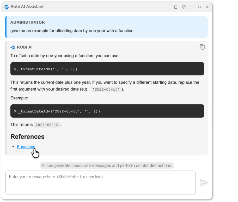 If Robi draws on product documentation when answering a question, it will include links to References at the end of the response that go to the relevant documentation pages.
