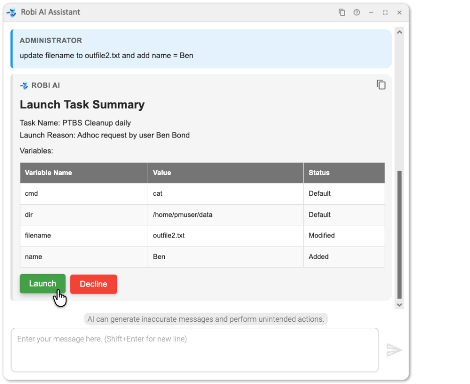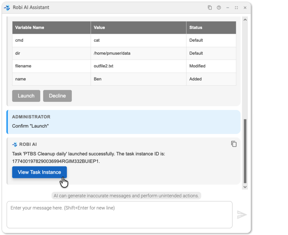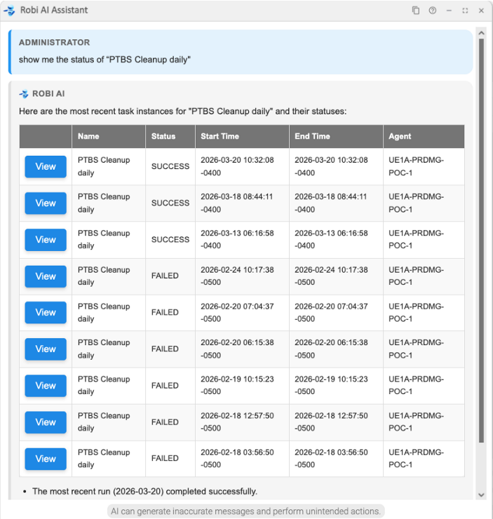 As an AI chat, the Robi AI Assistant can dynamically respond to prompts given in natural language. This gives Robi flexibility in performing many kinds of actions, but it is best suited to help with everyday operations in Universal Controller, such as viewing, updating, and launching tasks and workflows.
