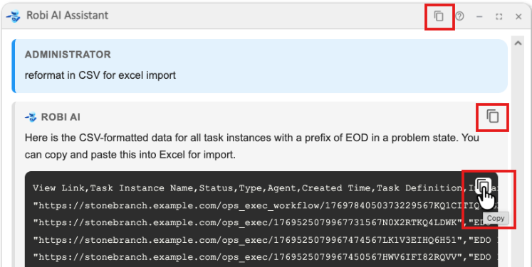You can copy individual messages, code blocks, or the entire conversation with the Copy buttons in the chat window.