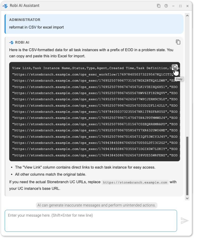 For any response, we can ask Robi AI to "show in a code block" to get a format with a Copy button. Or, if we have a specific data format in mind, we can ask Robi AI to reformat the response.