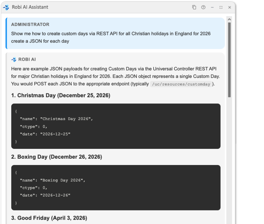 - Stay on topic. Robi AI is designed to assist with Universal Controller operations and documentation. It may decline to answer questions that fall outside this scope.