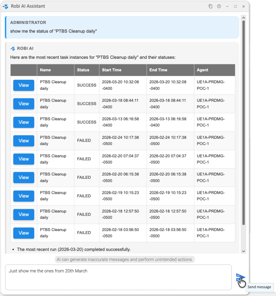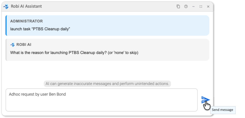First, we ask Robi AI Asisstant to launch a task called "PTBS Cleanup Daily".