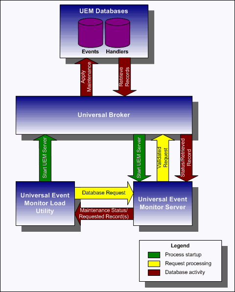 UEMLoad handles all event definition and event handler database management tasks, including adds, updates, deletes, and lists / exports. UEMLoad forwards a database request to a UEM Server, which validates the information. The UEM Server then sends a request to a local Universal Broker to apply the requested operation to the appropriate UEM database file.