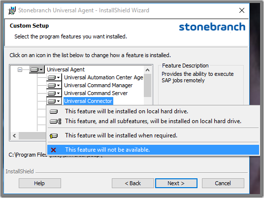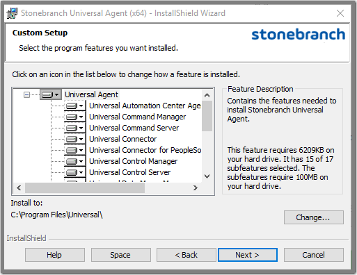 Step 5 | The previous figure indicates that all Universal Agent components will be installed in their respective directories under the C:\Program Files\Universal directory.