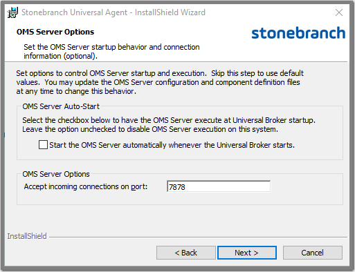 Step 11 | Select whether or not you want the Universal Message Service (OMS) Server to start up when Universal Broker starts up and, optionally, change the OMS Server port connection (the default port, 7878, is pre-selected). |