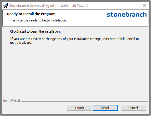Click the Install button to begin the installation or click the <Back button to return to change information on any of the previous dialogs.