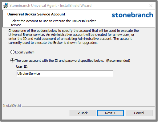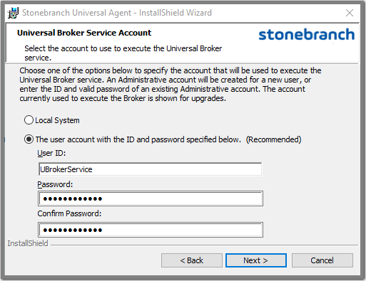 The Broker service may also be run using a Windows domain account. The primary difference between using a local and domain account is that the domain account must already exist, and the installation will not configure it like it does a new local account. Required account privileges and file system access can be found in Service Security. info For upgrades, if the Universal Broker service is already configured to run with a user account, the install dialog shows only the account name and omits the password fields. The Broker service's configuration in the Windows Service Control Manager is retained across upgrades, making it unnecessary to re-enter account information during an upgrade.