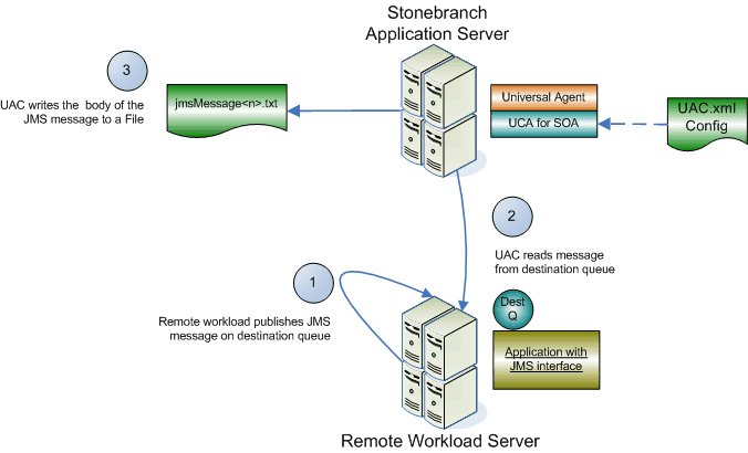 It consists of a remote application workload publishing a JMS message using the JMS protocol to a specified destination queue hosted by the JMS provider. The JMS provider, which hosts the queues that represent the JMS destination, can be located on a remote application server or on the local application server that hosts Universal Event Monitor for SOA.