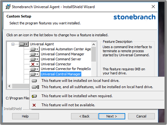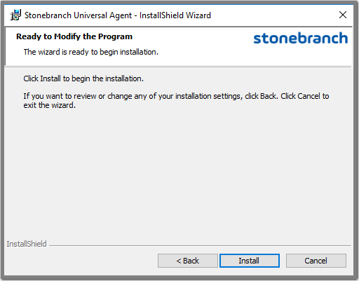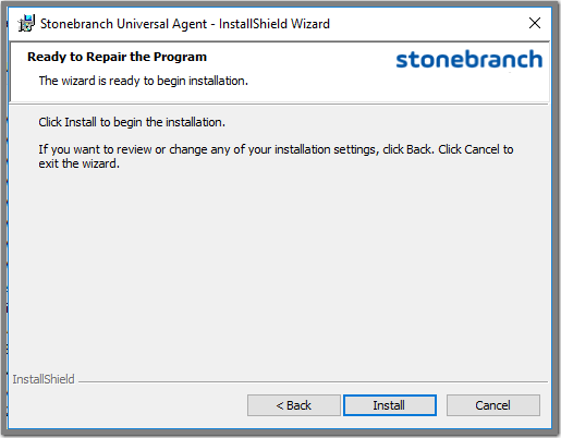 Step 5 | Click the Install button to repair the Stonebranch Universal Agent installation. |