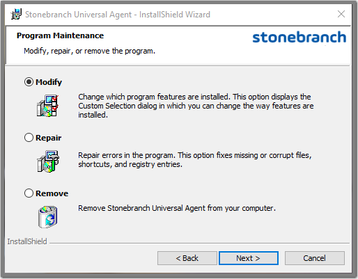 After Universal Agent is installed, the Windows Installer can be run as many times as needed to modify the installation by: