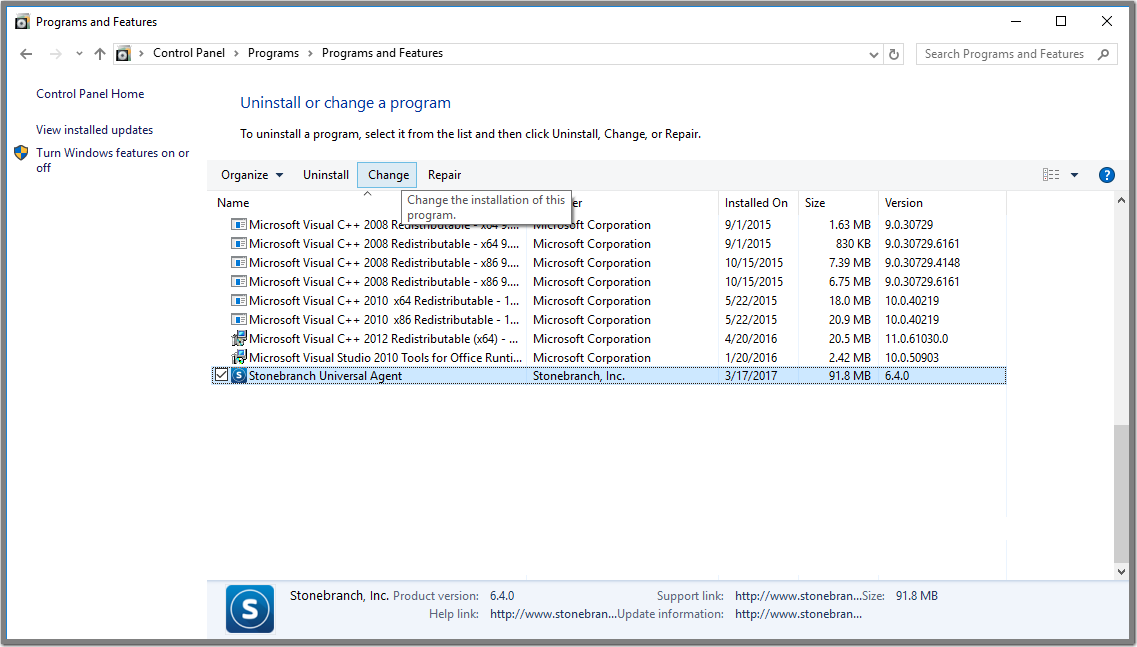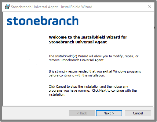 Step 2 | From the list of installed programs, select Stonebranch Universal Agent and click Change to start Windows Installer. The Welcome dialog displays.