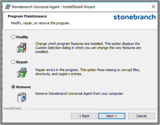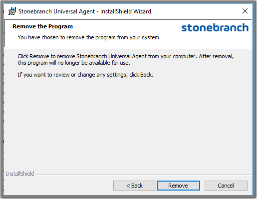 Step 5 | Click the Remove button to remove the Stonebranch Universal Agent installation. |