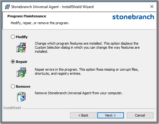 Windows Installer has the ability to recover accidentally deleted application files, configuration and component definition files, and registry entries required by Universal Agent. This repair feature will re-install the missing items, making a complete re-install unnecessary.