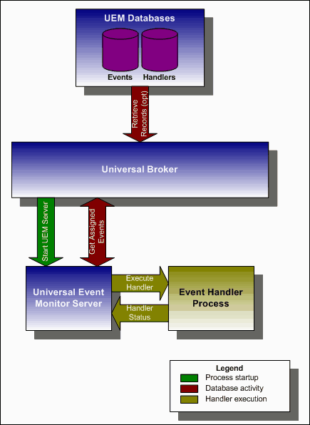 When an event-driven UEM Server starts, it sends a request to the Broker asking for all of the event definitions residing in the event definition database that are assigned to that event-driven UEM Server. (This assignment was made when the event definition record was added to the database with UEMLoad.) The Server checks the active and inactive dates and times of the event definitions that it receives. It then begins monitoring the active events.