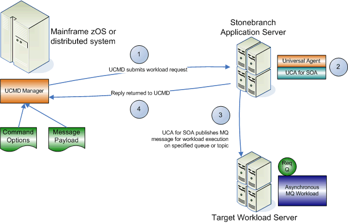 Universal Command is executed requesting the MQ workload. The command options for Universal Command Agent for SOA: MQ Connector are read in from a script file specified with the SCRIPT_FILE option and the message payload is read in via STDIN. UCMD then sends the workload request to Universal Command Agent for SOA, specifically the UAI component.