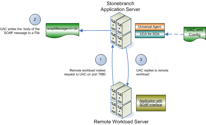 Step 1 | The application workload makes a SOAP request to Universal Event Monitor for SOA using the SOAP protocol on port 7880. Note that Universal Event Monitor for SOA consumes the message locally, meaning on the server that hosts Universal Event Monitor for SOA. |