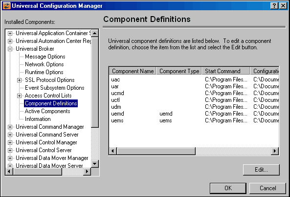 The component definitions for all Universal Agent are identified in the Component Definitions property page of the Universal Broker, as shown below.
