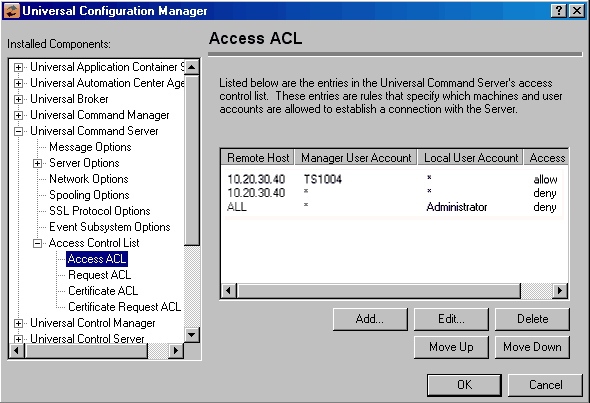 Although UACL files can be edited with any text editor (for example, Notepad), the Universal Configuration Manager application, accessible via the Control Panel, is the recommended way to update UACL entries. From there, ACL entries can be added, changed, deleted or sorted (rules are applied in the order in which they are listed).
