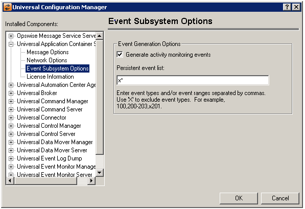 Event Generation Options | Generate activity monitoring events Persistent event list Enter a list and/or range of numeric event types, separated by a comma. To exclude an event or range of events, precede the entry with an upper- or lower-case 'X'. Use an asterisk ( * ) to specify all event types. For example:
