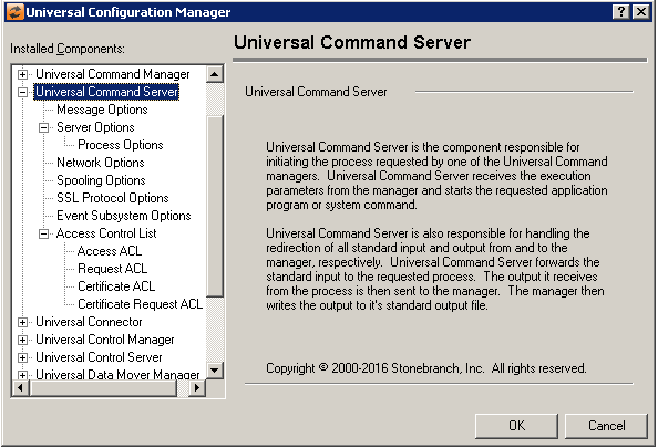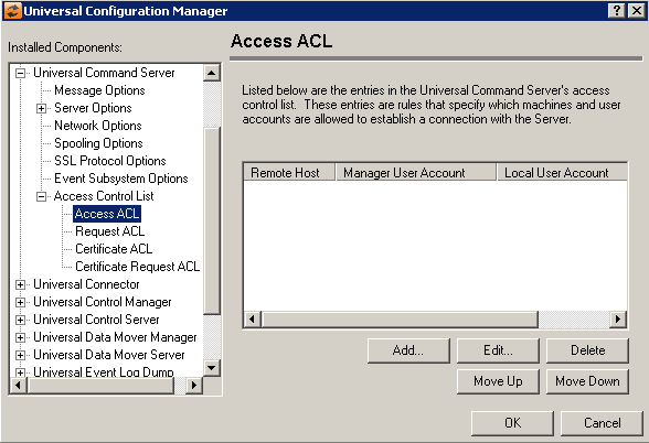 Access Control List | Displays the entries contained in the Universal Command Server Access Control List (ACL). This list is used to grant or deny access to Universal Command Server based on the remote system's IP address, the user account running the Universal Command Manager, and the user account with which the Server is executed. The order in which ACL entries are evaluated and applied are based on their position in this list. Use the Move Up and Move Down buttons to change an entry's priority. |
