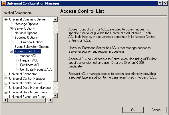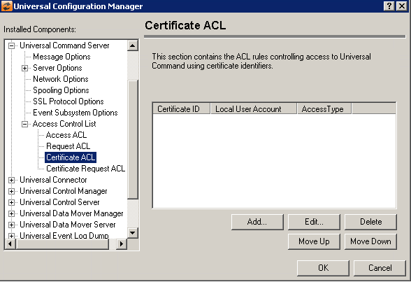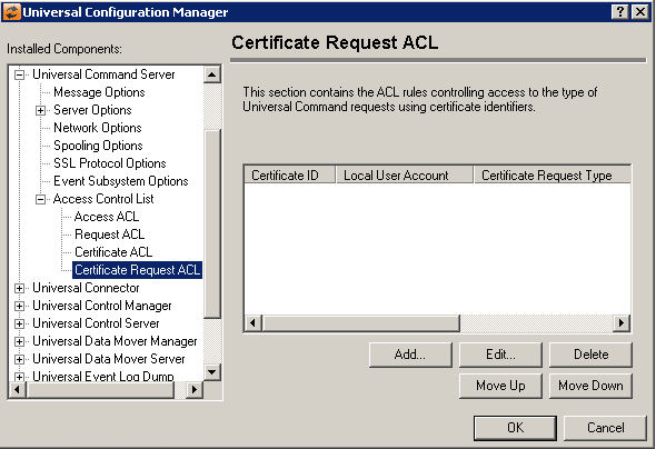 Certificate Request ACL List | Displays the entries contained in the Universal Command Certificate Request Access Control List (ACL). The order in which ACL entries are evaluated and applied are based on their position in this list. Use the Move Up and Move Down buttons to change an entry's priority. |