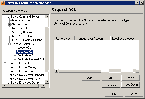 Request ACL List | Displays the entries contained in the Universal Command Request Access Control List (ACL). The order in which ACL entries are evaluated and applied are based on their position in this list. Use the Move Up and Move Down buttons to change an entry's priority. |