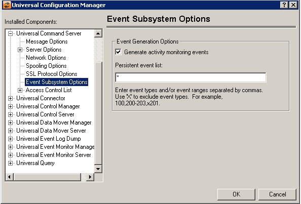 Event Generation Options | Generate activity monitoring events Persistent event list Enter a list and/or range of numeric event types, separated by a comma. To exclude an event or range of events, precede the entry with an upper- or lower-case 'X'. Use an asterisk (*) to specify all event types. For example: