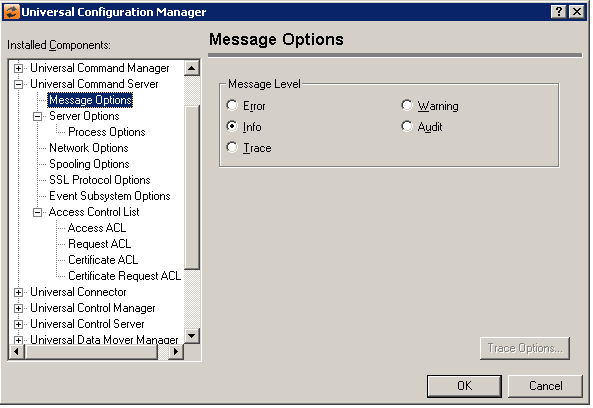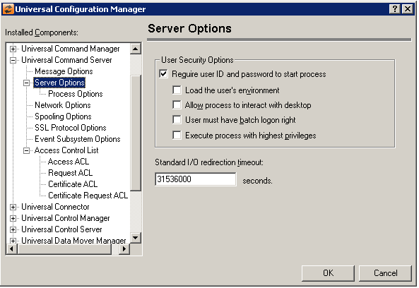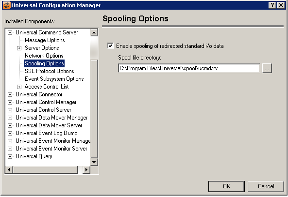 Enable spooling of redirected standard i/o data | Controls whether or not the Universal Command Server will allow redirected input and output to be spooled. When checked, the Universal Command Server will spool redirected i/o, provided the Universal Command Manager has requested it. If this option is not checked, no spooling will be done, and all requests by Universal Command Managers to do so will be rejected. |