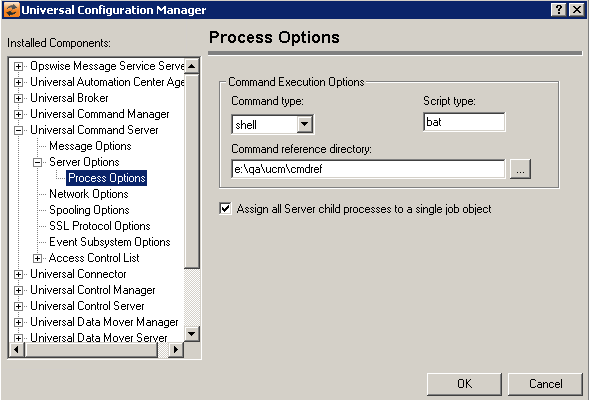 Assign all Server child processes to a single job object | This option instructs a Universal Command Server how to manage the relationship between it and the child processes it creates. When this option is checked, the child process Universal Command Server starts - and any of that process's descendants - are assigned to a single entity known as a job. Assigning a process to a job simplifies process management, by causing all child processes (that is, the requested user process and any of its child processes) to terminate whenever their parent is cancelled (that is, Universal Command Server). When this option is NOT checked, no relationship among child processes is maintained, and each child process must be terminated individually when a Universal Command Server component is cancelled. This is the behavior exhibited in Universal Command Server releases prior to v3.2.0.0. Note: The value for this option may be overridden from the remote Universal Command Manager's command options on a per-request basis. |