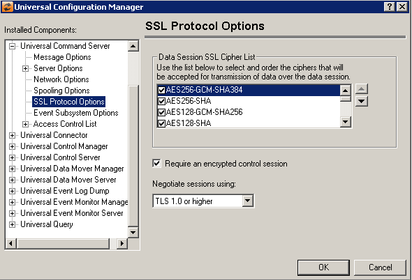 Require and encrypted control session | Select this option to require encryption over the control session between the UCMD Manager and Server. When this option is selected, the UCMD Server will not accept a control session SSL/TLS cipher of NULL-NULL from the remote UCMD Manager. When this option is not selected, the UCMD Server will accept any control session cipher from the UCMD Manager, even one that disables SSL/TLS encryption. This option is checked by default. |
