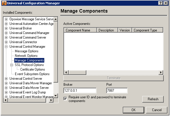 Require user ID and password to terminate components | When checked, a dialog will be displayed when the Terminate button is selected that will prompt for a user ID and password. This is necessary if either of the following are true: a) the Universal Control Server is configured to run with security, or b) the Universal Control Server has an ACL entry that requires user authentication.