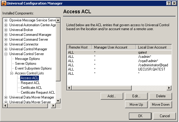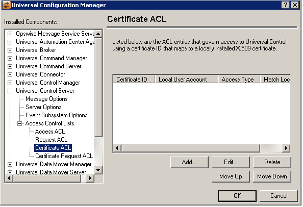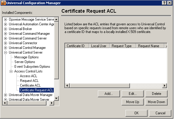Certificate Request ACL List | Displays the entries contained in the Universal Control Server Access Control List (ACL). This list is used to grant or deny access to specific Universal Control Server requests based on a remote user who is identified by a certificate ID (which maps to a locally installed X.509 certificate), and a locally authenticated user account. The order in which ACL entries are evaluated and applied are based on their position in this list. Use the Move Up and Move Down buttons to change an entry's priority. |