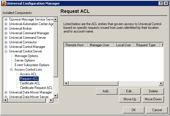 Request ACL List | Displays the entries contained in the Universal Control Server Access Control List (ACL). This list is used to grant or deny the ability to issue specific Universal Control Server requests based on the remote system's IP address, the user account running the Universal Control Manager, and a locally authenticated user account. The order in which ACL entries are evaluated and applied are based on their position in this list. Use the Move Up and Move Down buttons to change an entry's priority. |