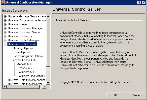 Access Control List | Displays the entries contained in the Universal Control Server Access Control List (ACL). This list is used to grant or deny access to Universal Control Server based on the remote system's IP address, the user account running the Universal Control Manager, and the user account with which the Server is executed. The order in which ACL entries are evaluated and applied are based on their position in this list. Use the Move Up and Move Down buttons to change an entry's priority. |
