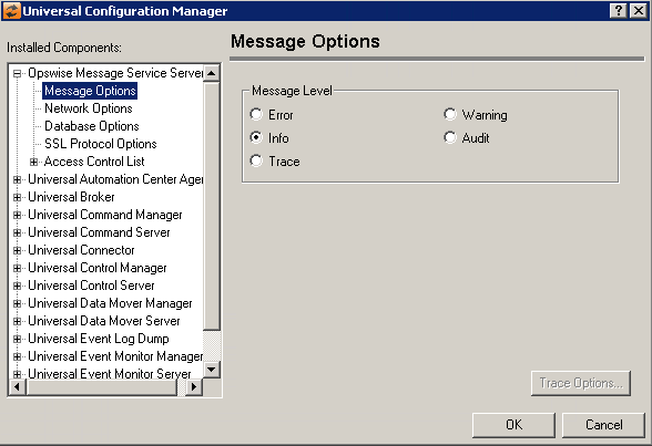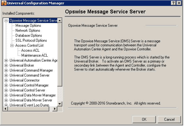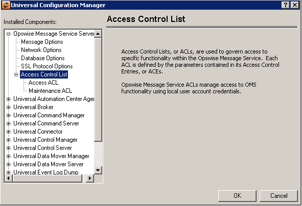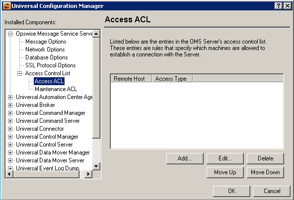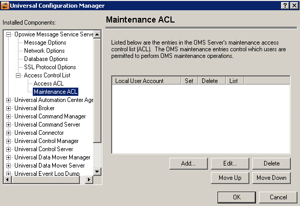 Maintenance ACL List | Displays the entries contained in the Universal Message Service (OMS) Server Maintenance Access Control List (ACL). This list is used to grant or deny access to OMS Server maintenance based upon the user account with which the maintenance is executed. The order in which ACL entries are evaluated and applied are based on their position in this list. Use the Move Up and Move Down buttons to change an entry's priority. |