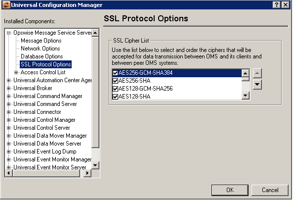 SSL Cipher List | The SSL/TLS cipher list specifies one or more acceptable cipher suites to use for network communication. The list consists of one or more cipher suites ordered with the most preferred suite first and the least preferred suite last. |