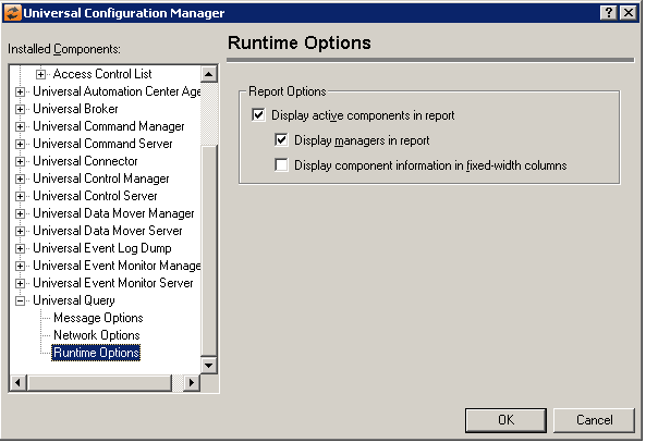 Report options | Display Active Components in report Display managers in report Display component information in fixed-width columns |