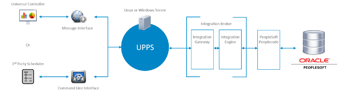 Universal Connector for PeopleSoft Process Scheduler (UPPS) controls background processing within a PeopleSoft system either from a command line or from a Universal Controller task. The command line interface allows any computer (and therefore any scheduling tool) on the network to manage PeopleSoft Process Scheduler background processing tasks via the local command line.