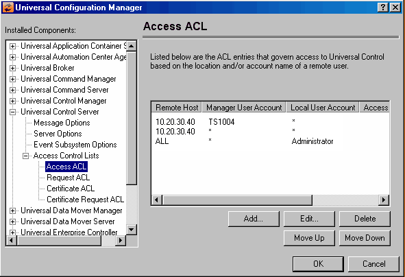 Although UACL files can be edited with any text editor (for example, Notepad), the Universal Configuration Manager application, accessible via the Control Panel, is the recommended way to update UACL entries. From there, ACL entries can be added, changed, deleted or sorted (rules are applied in the order in which they are listed).