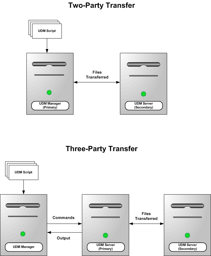 With a two-party transfer session, the secondary server is invoked by the manager / primary server via the Universal Broker. The second endpoint of the transfer session will be on the machine in which the secondary server was spawned. Transfer operations occur between the manager / primary server and the secondary server.