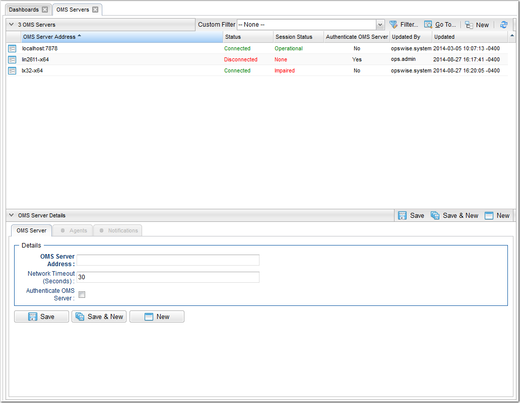 Step 4 | To check for your newly installed OMS Server, select System > OMS Servers from the Agents & Connections navigation pane. You will see a list similar to the following example, which includes the OMS Server that you just installed as part of the Agent package. Make sure the OMS Server Status is Active.