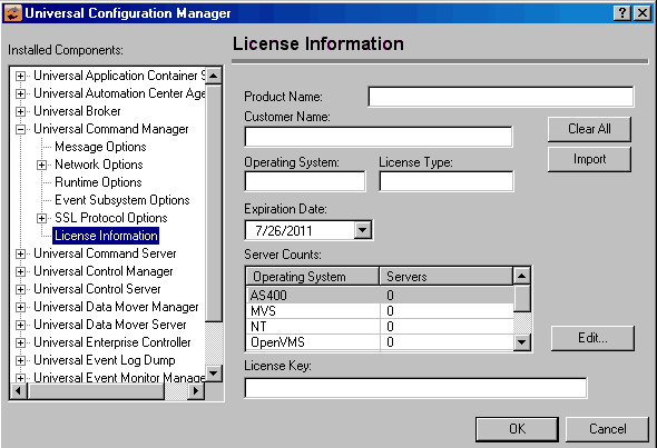 2. Specifying the information on the Universal Configuration Manager License Information page for that component, either by.